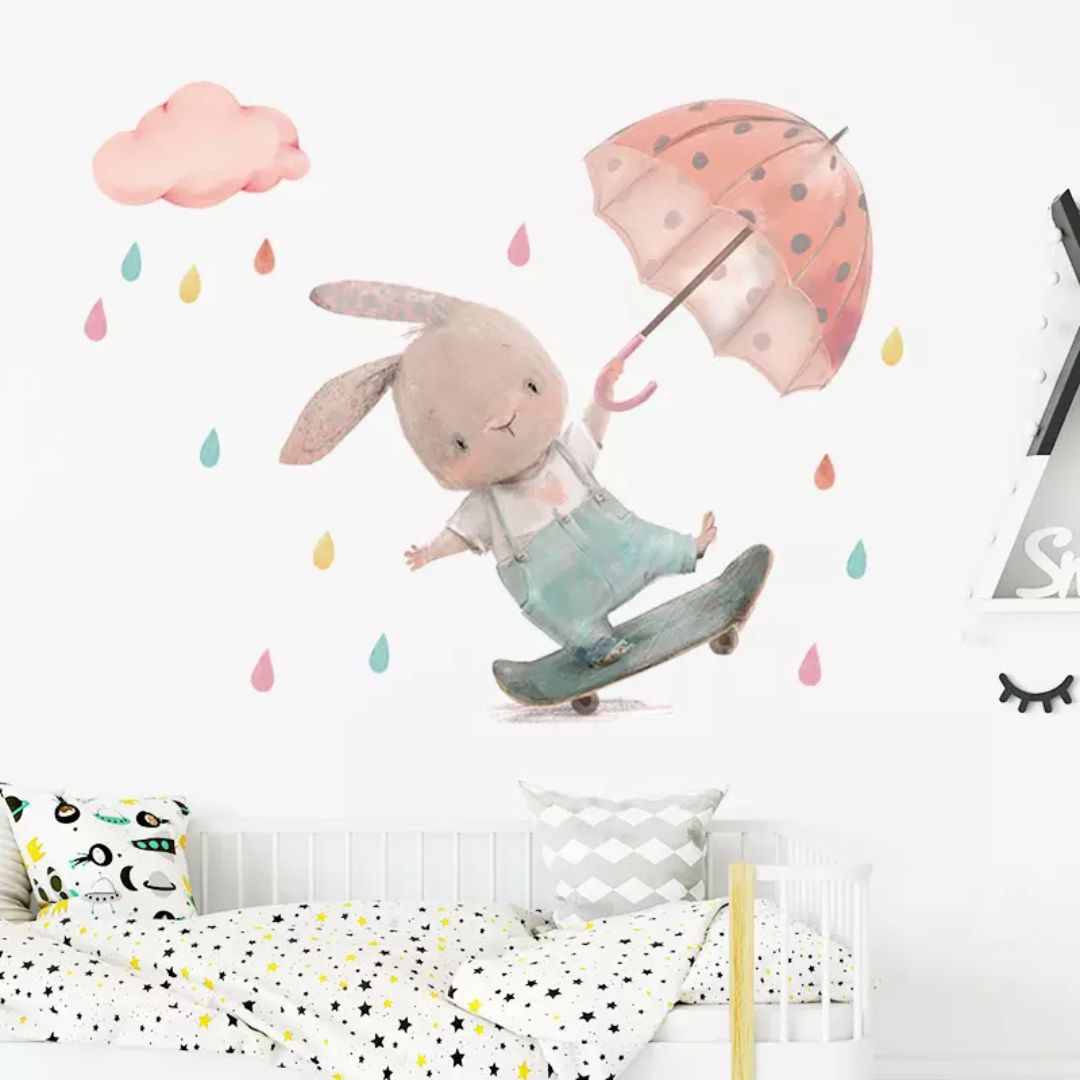 Einfach den Sticker von der Folie lösen und auf die Wände aufkleben. Dieser wirkungsvolle Blickfang im Kinderzimmer Deines Süßlings mit witzigem Motiv wertet die beklebte Oberfläche schnell und unkompliziert auf ohne langes aufwendiges renovieren. Dieser Wandsticker mit kleinem mutigem Häschen auf dem Skateboard bringt Kinderaugen zum Staunen und gibt dem dekorierten Raum einen individuellen, unverwechselbaren Charme. Ein schnelles und einfach zu installierendes Element für Flexibilität und Experimentierfreiheit im Zimmer der kleinen Miniwesen.