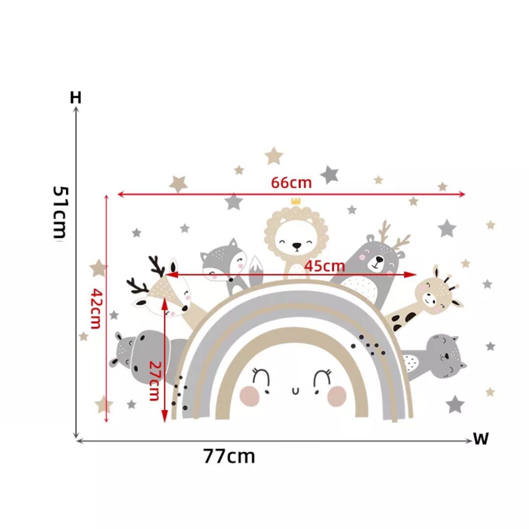 Dieses süße Tierfreunde Wandtattoo fürs Kinderzimmer ist ein wirkungsvoller Blickfang im Reich der kleinen Süßlinge. Der verspielte Regenbogen, die vielen Charaktere und Sterne bringen Frohsinn und Leichtigkeit in den Raum der Miniwesen. Das Wandtattoo wertet Oberflächen schnell und unkompliziert auf ohne langes aufwendiges renovieren. Es bringt Kinderaugen zum Staunen, regt die Fantasie an und gibt dem Raum einen individuellen, unverwechselbaren Charme. Sie sind schnell und einfach installiert und schaffen Flexibilität und Experimentierfreiheit im Zimmer der kleinen Miniwesen. Durch die neutralen Farben kann es vielseitig mit anderen Deko-Elementen kombiniert werden.