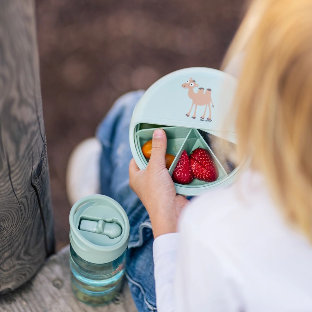 Kindertrinkflasche Mintgrün mit Kamel – Die clevere Lösung für Trinken & Snacken unterwegs