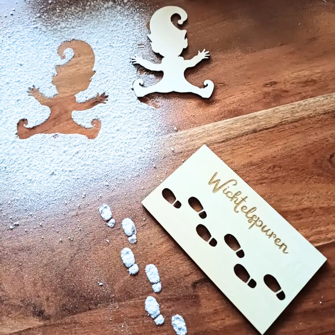 Du kannst die Schablone nicht nur auf dem Küchentisch verwenden, sondern auch auf dem Boden oder sogar im Schnee – überall, wo du kleine magische Wichtelspuren hinterlassen möchtest! Ob im Kinderzimmer oder im Wohnzimmer, die Spuren machen die Adventszeit unvergesslich und zu einem echten Erlebnis für die Kleinen.