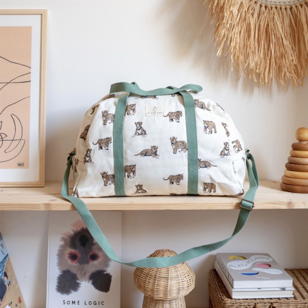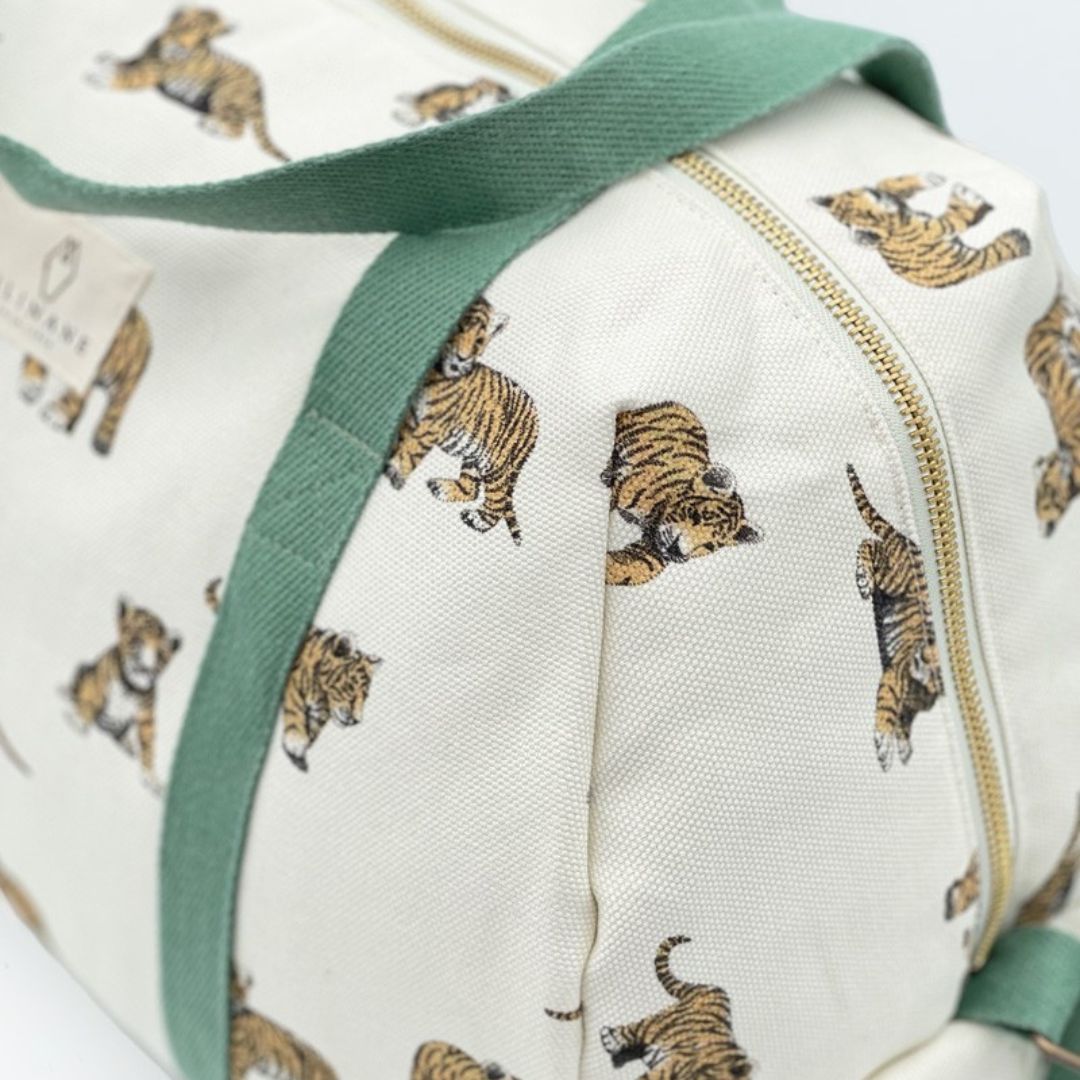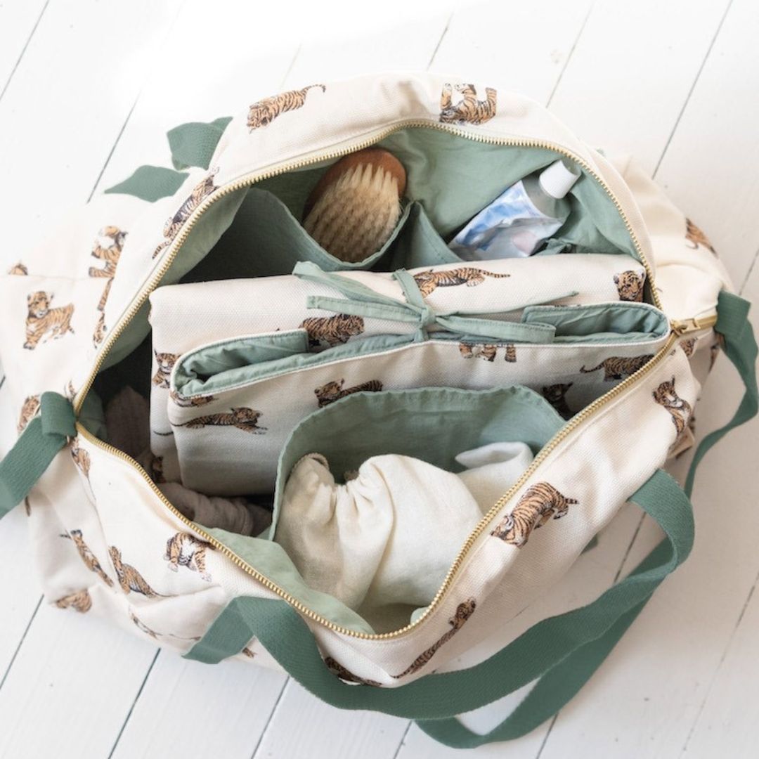 Entdecke die urbane Wildnis mit unserer neuen Wickeltasche im angesagten Tigermuster und salbeifarbenen Griffen!  Mit einer großzügigen Öffnung, die von einem goldenen Reißverschluss betont wird, ist diese Tasche nicht nur stylisch, sondern auch äußerst praktisch.