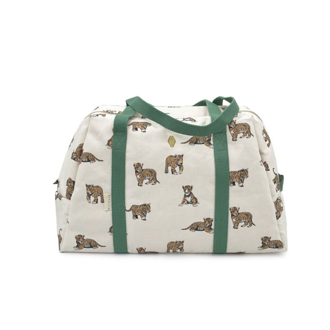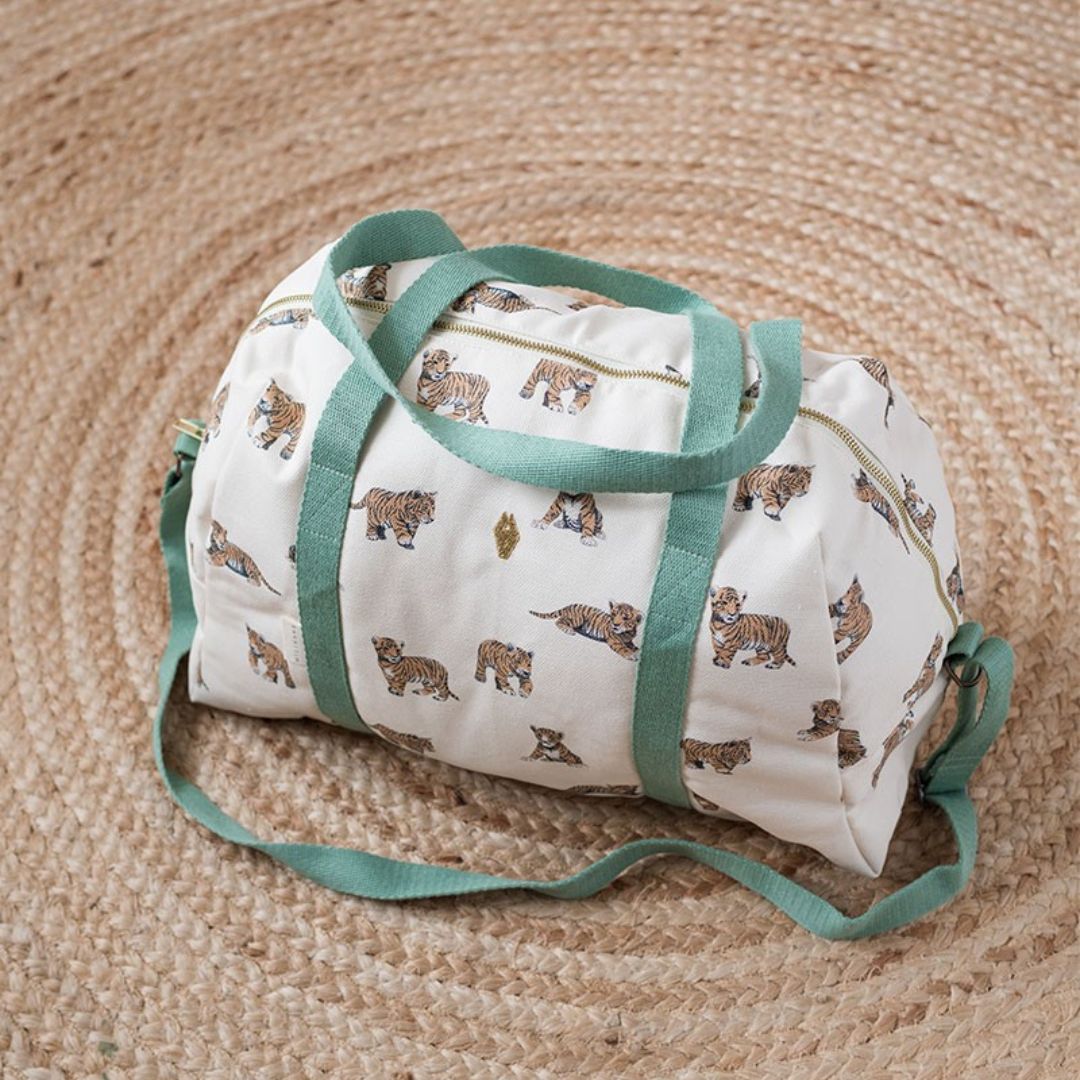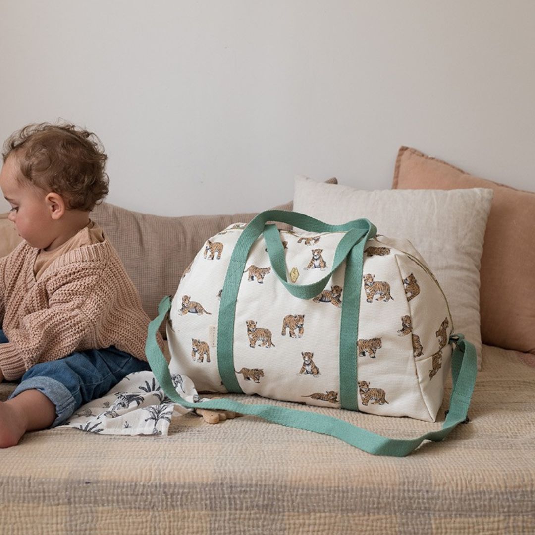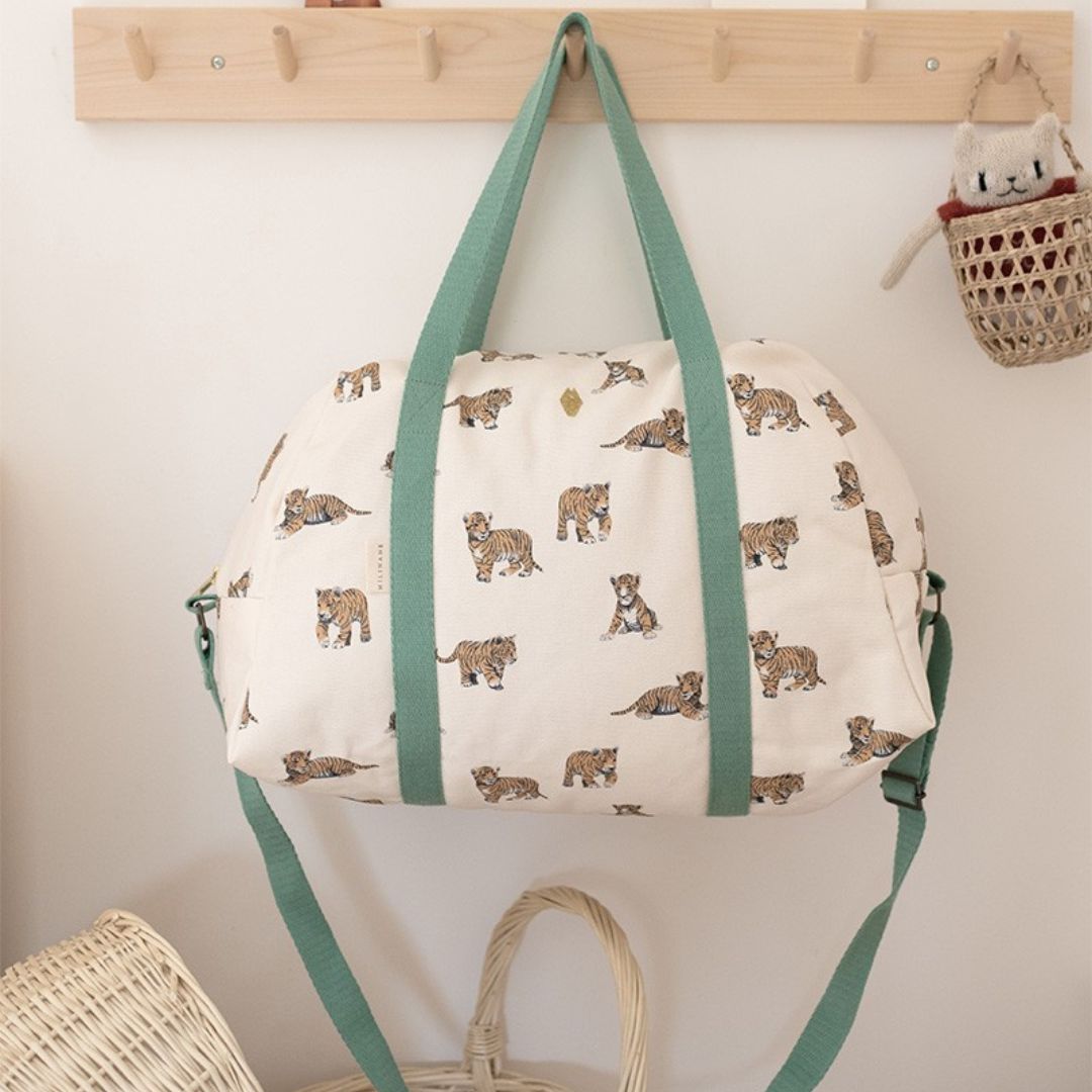Entdecke die urbane Wildnis mit unserer neuen Wickeltasche im angesagten Tigermuster und salbeifarbenen Griffen!  Mit einer großzügigen Öffnung, die von einem goldenen Reißverschluss betont wird, ist diese Tasche nicht nur stylisch, sondern auch äußerst praktisch.