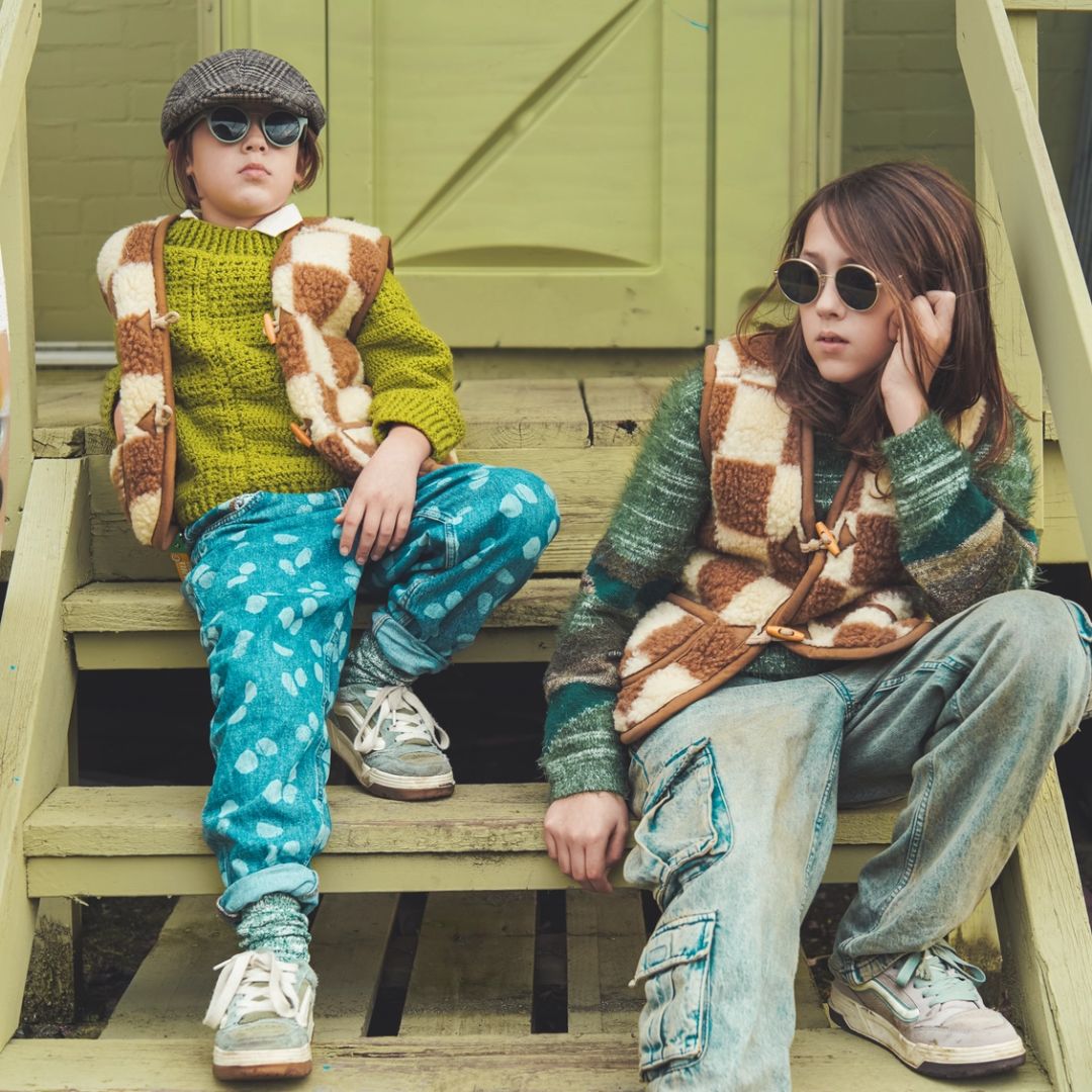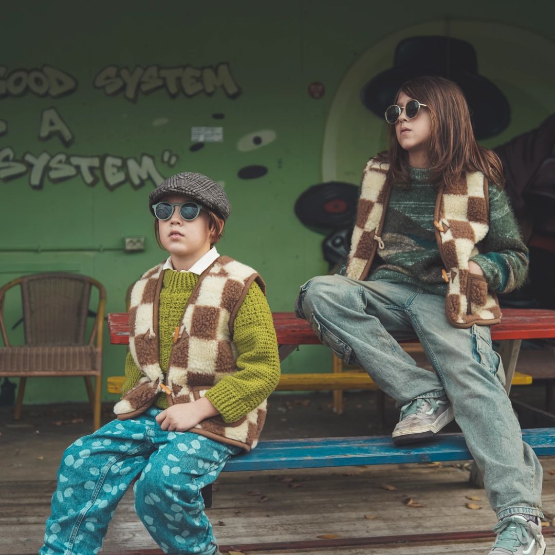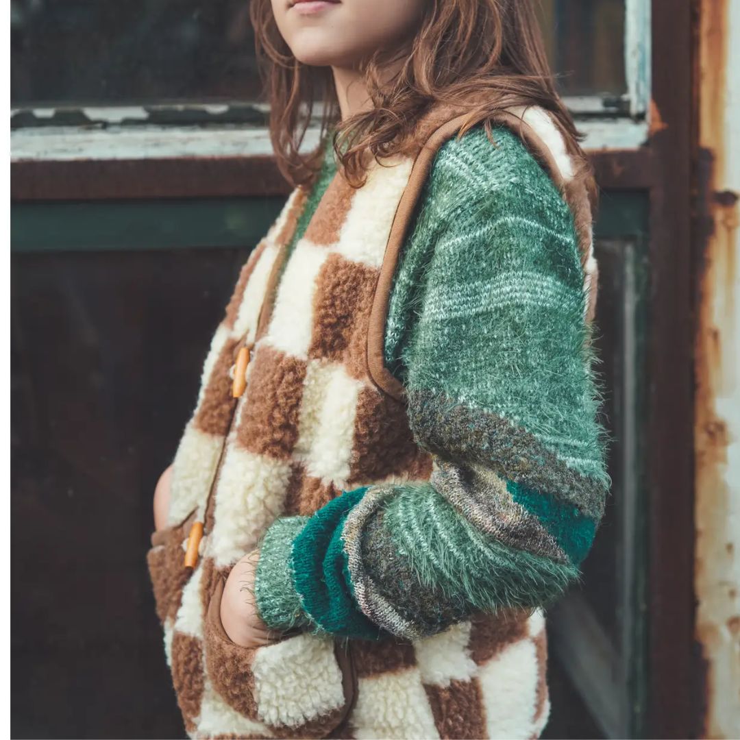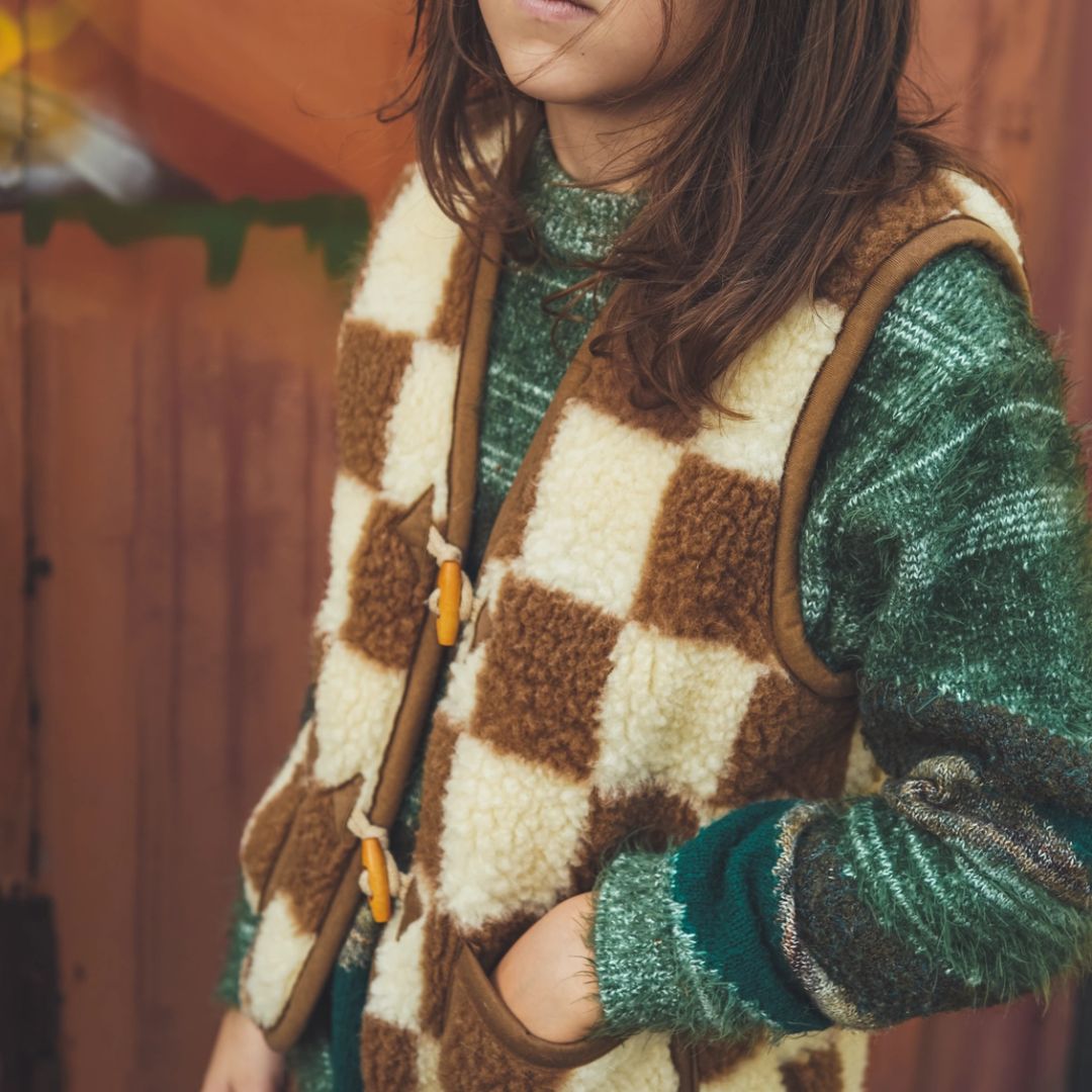 Die Brick Kinder Wollweste kombiniert Naturfarben mit einem verspielten Karodesign, das neutral, fröhlich und zeitlos ist. Dadurch lässt sie sich ganz einfach mit anderer Kinderkleidung kombinieren: