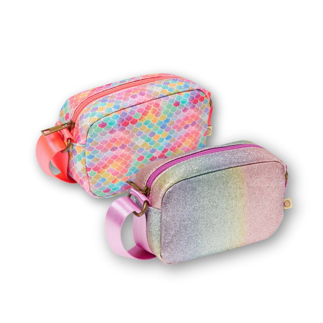 In dieser funkelnden Regenbogen-Tasche können viele Lieblingsteile aufbewahrt werden. Die Tasche wird oben mit einem Reißverschluss geschlossen. Sie kann als Umhängetasche oder als Schultertasche getragen werden und sie hat einen verstellbaren Riemen in passender Farbe.